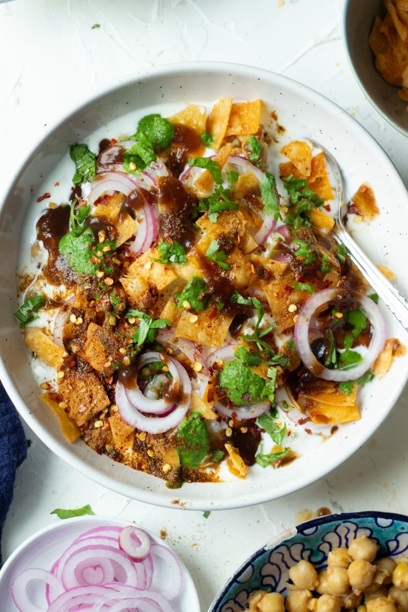 The original chaat is a mixture of potato pieces, crisp fried bread dahi vada or dahi bhalla, gram or chickpeas and tangy-salty spices, with sour Indian chili and saunth (dried ginger and tamarind sauce), fresh green coriander leaves and yogurt for garnish, but other popular variants included alu tikkis or samosa